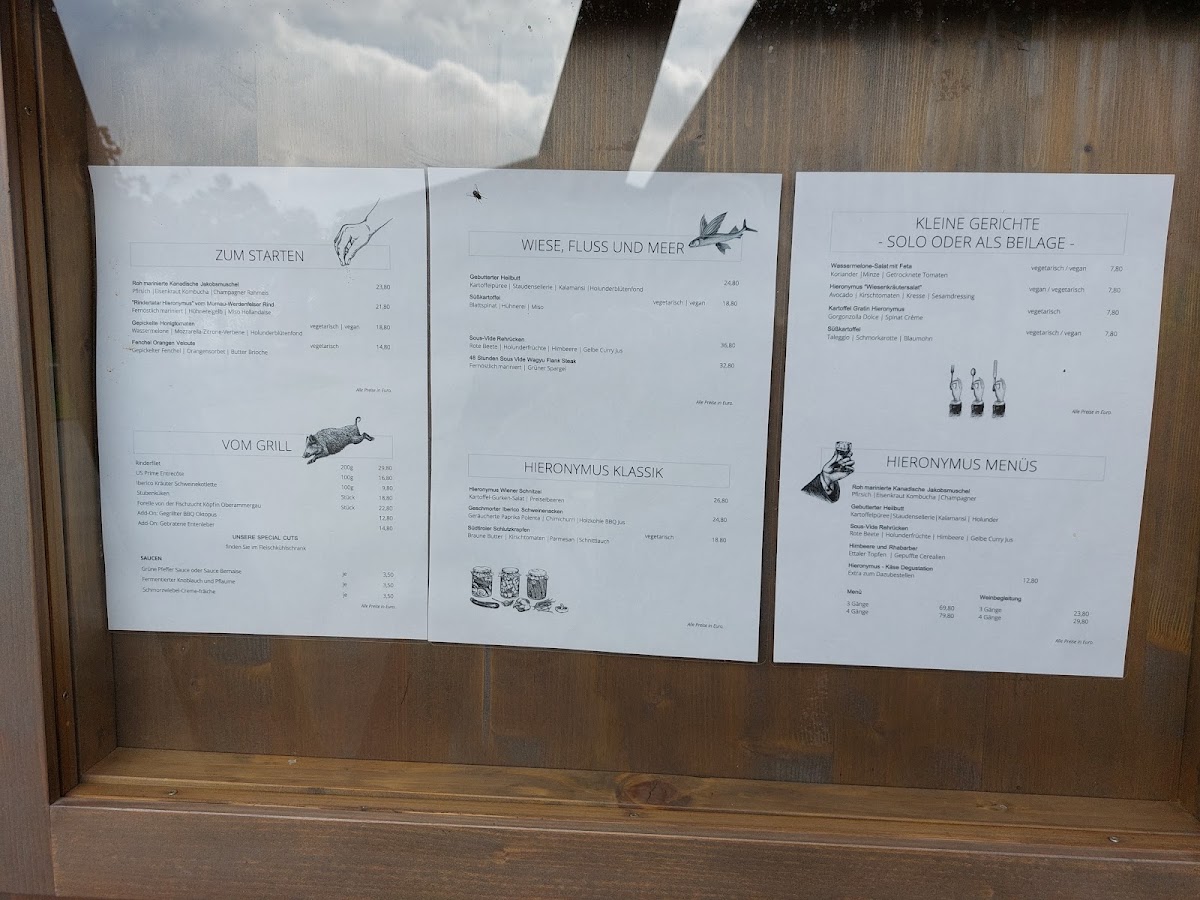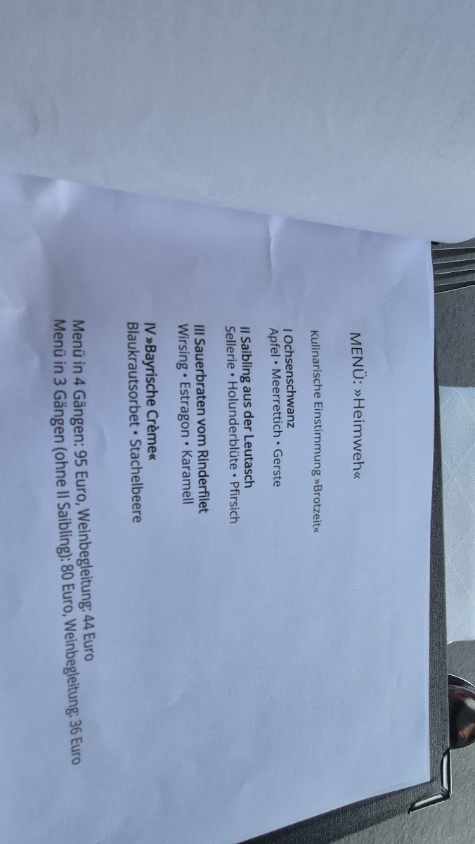 Wrapping up my look at Restaurant Hieronymus (Weiherweg 36, 82497 Unterammergau, Germany), the menu reads like a well-rounded drinks journey designed to match a refined dining mood rather than overwhelm with excess. For non-alcoholic refreshment, you’ll find classic fruit options like Apfelsaft 0,2l, Maracujanektar 0,2l, Organgensaft 0,2l, Pink Grapefruitsaft 0,2l, and Rhabarbernektar 0,2l-a simple but satisfying spread. Coffee lovers are equally covered with warm staples such as Café au lait, Cappuccino, Espresso, Espresso doppelt, and Espresso entcoffeiniert, ideal for an after-meal finish. If you’re in the mood to start with something celebratory, the aperitif and sparkling selection feels decidedly upscale, featuring Alma Grande Cuvée Brut I Cuvée 0,75l, Bollinger Rosé 0,75l, Brut Special Cuvée 0,75l, Chateau Saint Marie 0,75l, and Crémant de Bordeaux Blanc 0,75l. Beer fans can explore modern craft choices like Crew Roundhouse Kick 0,33l, Crew Drunkon Sailer IPA 0,33l, Crew Pale Ale Foundation 0,33l, Crew Easy 0,33l, and Crew 7:45 Escalation 0,33l. Wine is offered in approachable pours-Weißwein 0,1, Weißwein 0,2, Rotwein 0,1, Rotwein 0,2, plus Esterhazy 0,1-while the cocktail list keeps things stylish with Apulians, Bloody Mary, Bourbon & Hippy, Cosmopolitan, and Espresso Martini. Finally, the spirits lineup-Botucal Reserva Exclusiva 4cl, Don Papa 4cl, Mount Gay Barbados XO 4cl, Plantation Barbados 5 Years 4cl, and Smith e Cross Jamaica Rum 4cl-adds a confident, premium edge that neatly completes the overall offering.